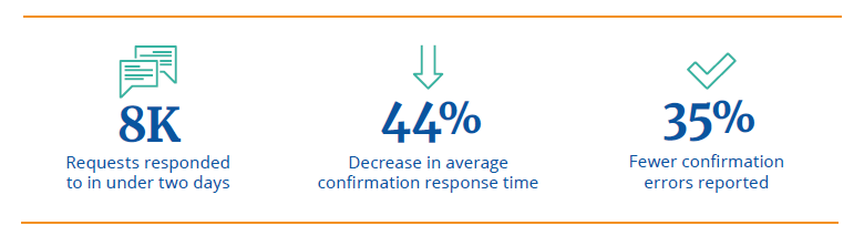 During the first quarter of 2018, the bank processed 96.25 percent of its requests in less than two days, a YOY increase of 30 percent. Additionally, the average response time between request and response decreased by 44 percent from 37.5 hours to 21 hours. “Confirmation is easy to use,” says the QPM specialist. “The detail of reporting really stands out and is very beneficial.”